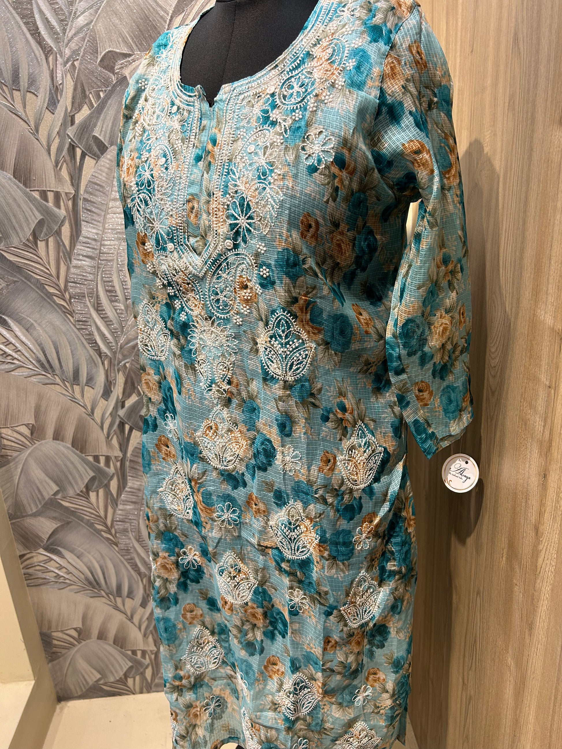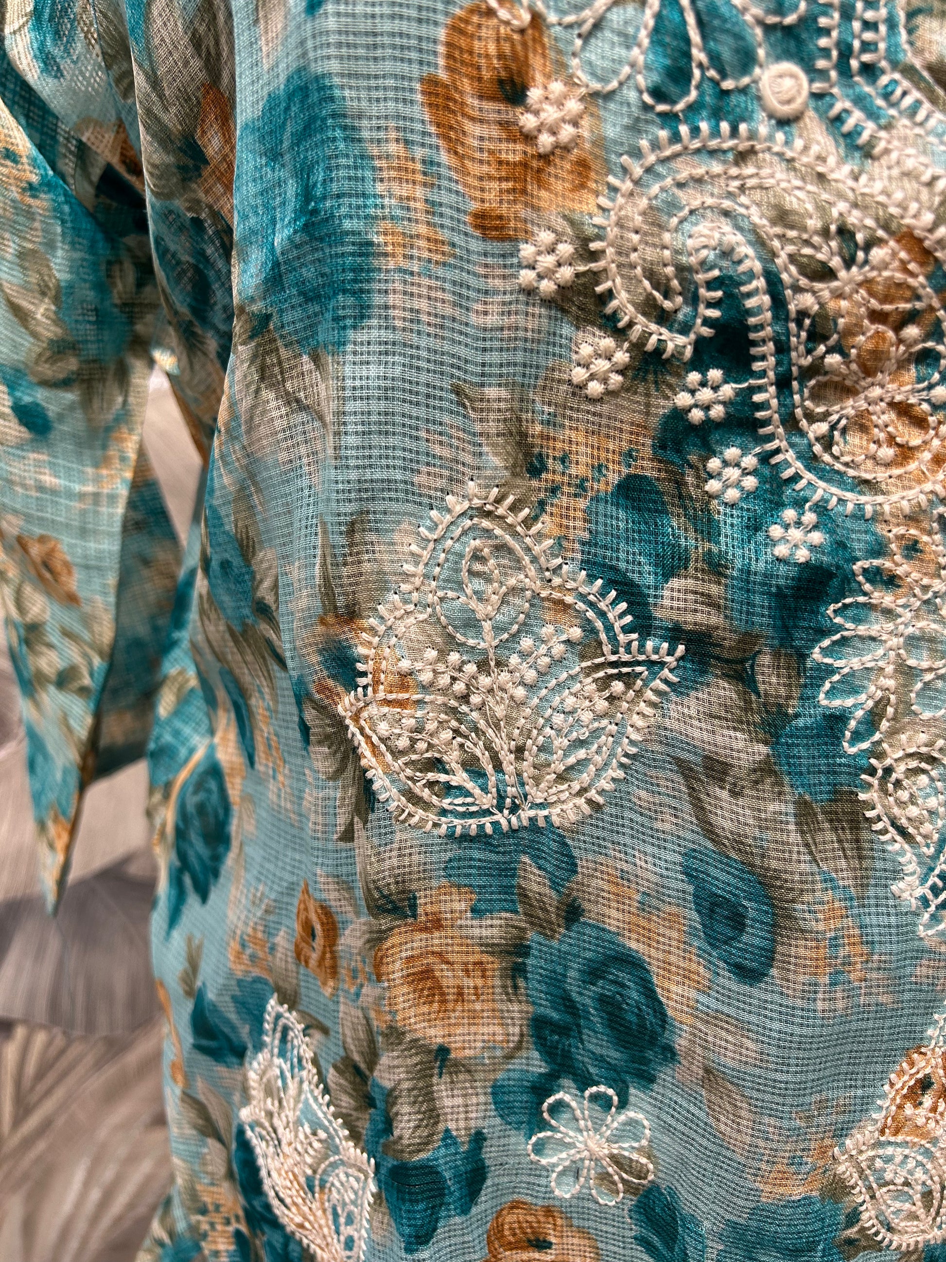 This breezy Kota cotton kurti blends vibrant artistry with everyday ease. The soft blue base is adorned with a watercolor-style floral print in earthy tones of brown and beige, elevated by detailed white thread embroidery across the yoke and sleeves. The lightweight, airy weave of Kota cotton makes it perfect for warm weather, while the intricate embroidery adds a refined, handcrafted touch.