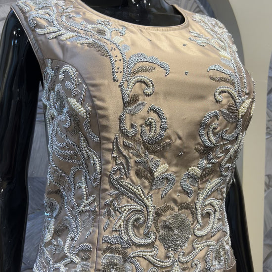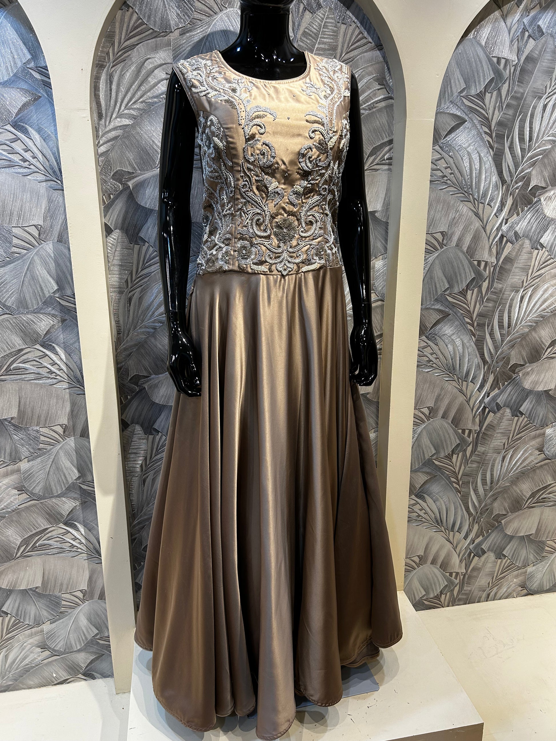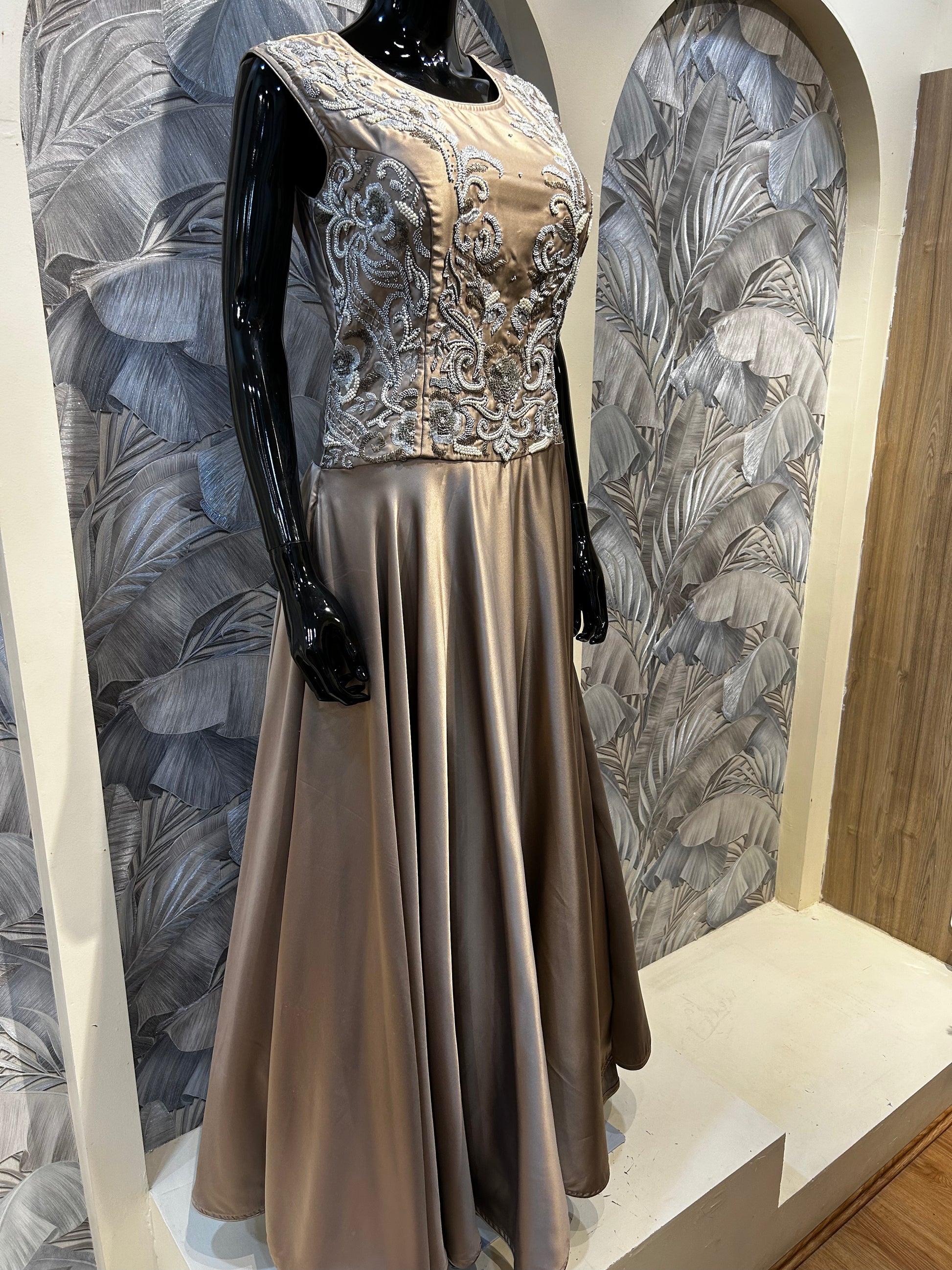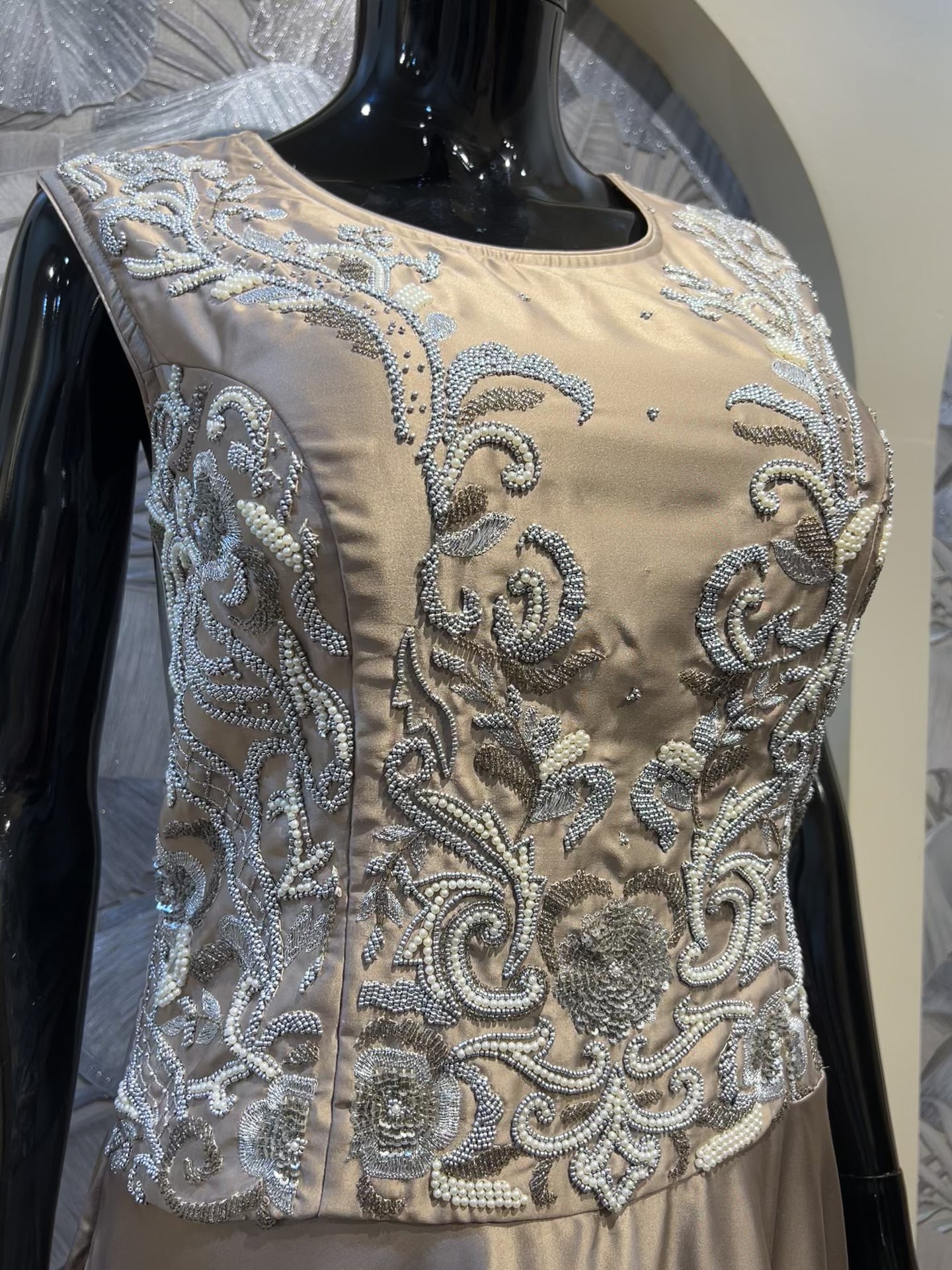 This elegant floor-length gown is crafted from lustrous champagne satin, exuding timeless sophistication. The sleeveless bodice is richly adorned with intricate silver threadwork and bead embellishments in ornate floral and swirl motifs, adding a refined texture and sparkle. The smooth satin skirt flows gracefully into a flared silhouette, creating movement and fluidity with every step. Perfect for evening soirées, receptions, or formal occasions, this gown balances understated luxury with statement detailing.