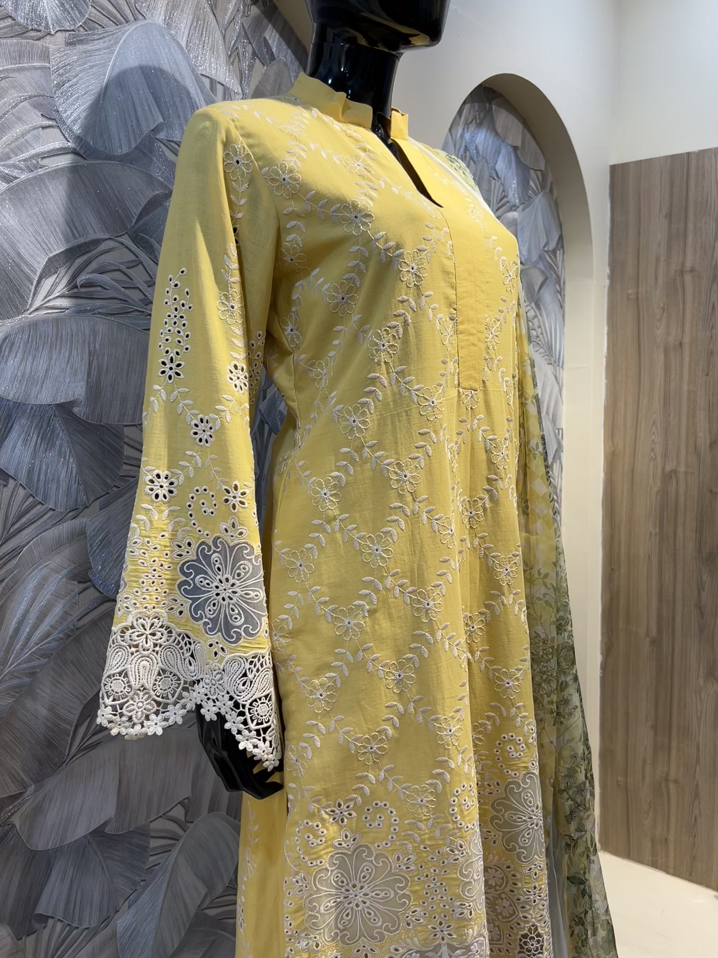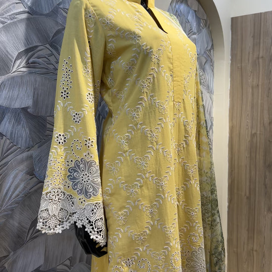 This vibrant suit in Crayola’s orange-yellow shade is tailored in breathable cotton, offering brightness with refined detail. The kurta is adorned with intricate white thread embroidery, accentuated by extensive eyelet cutwork along the hemline and sleeves that creates a striking lace-like effect. Large floral and geometric motifs add depth and artistry, while scalloped edges lend a delicate finish. Paired with a matching dupatta, this ensemble is ideal for festive occasions, summer gatherings, or cultural celebrations, combining bold color with timeless embroidery craftsmanship.