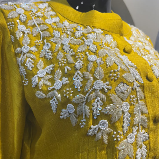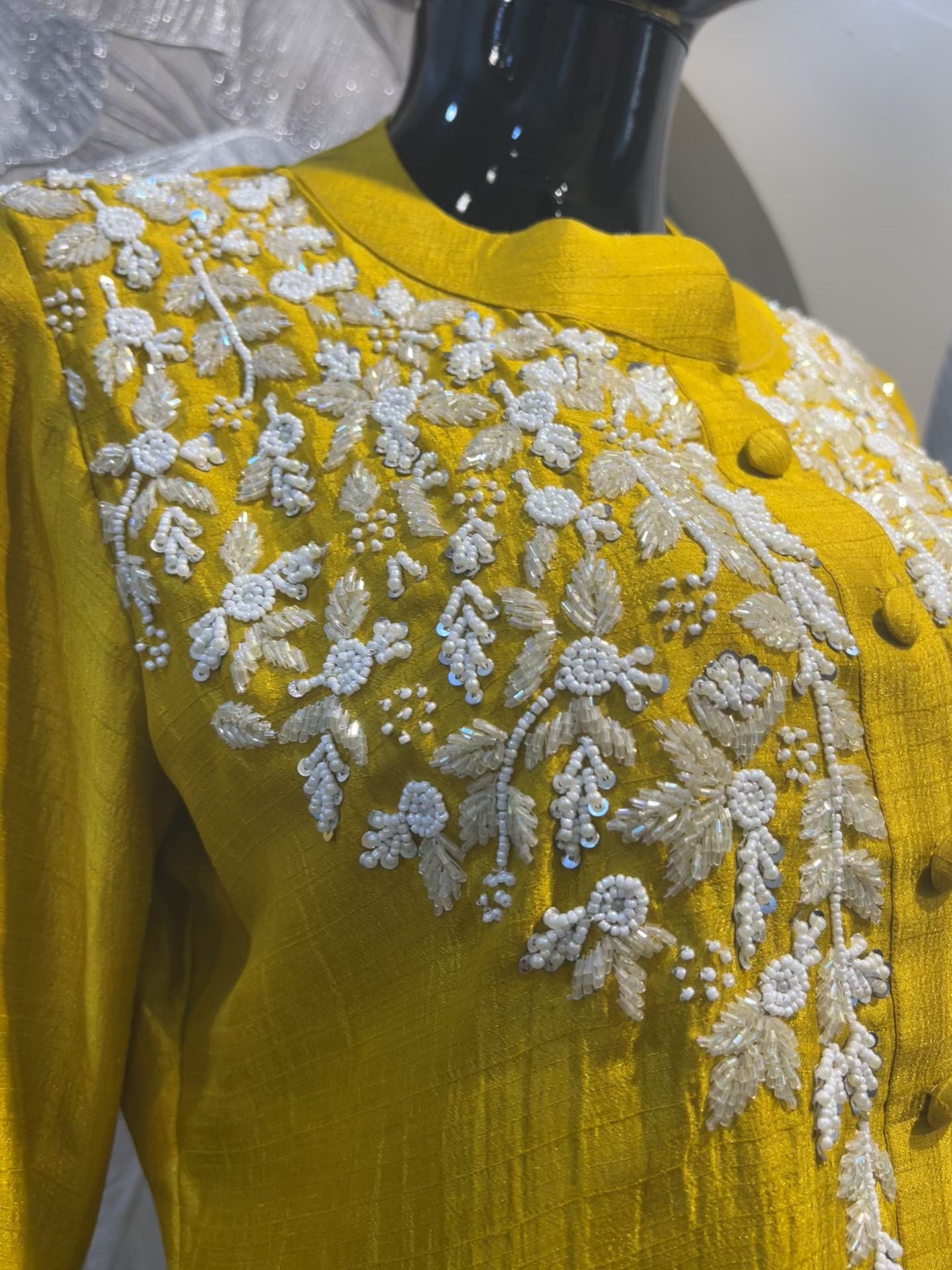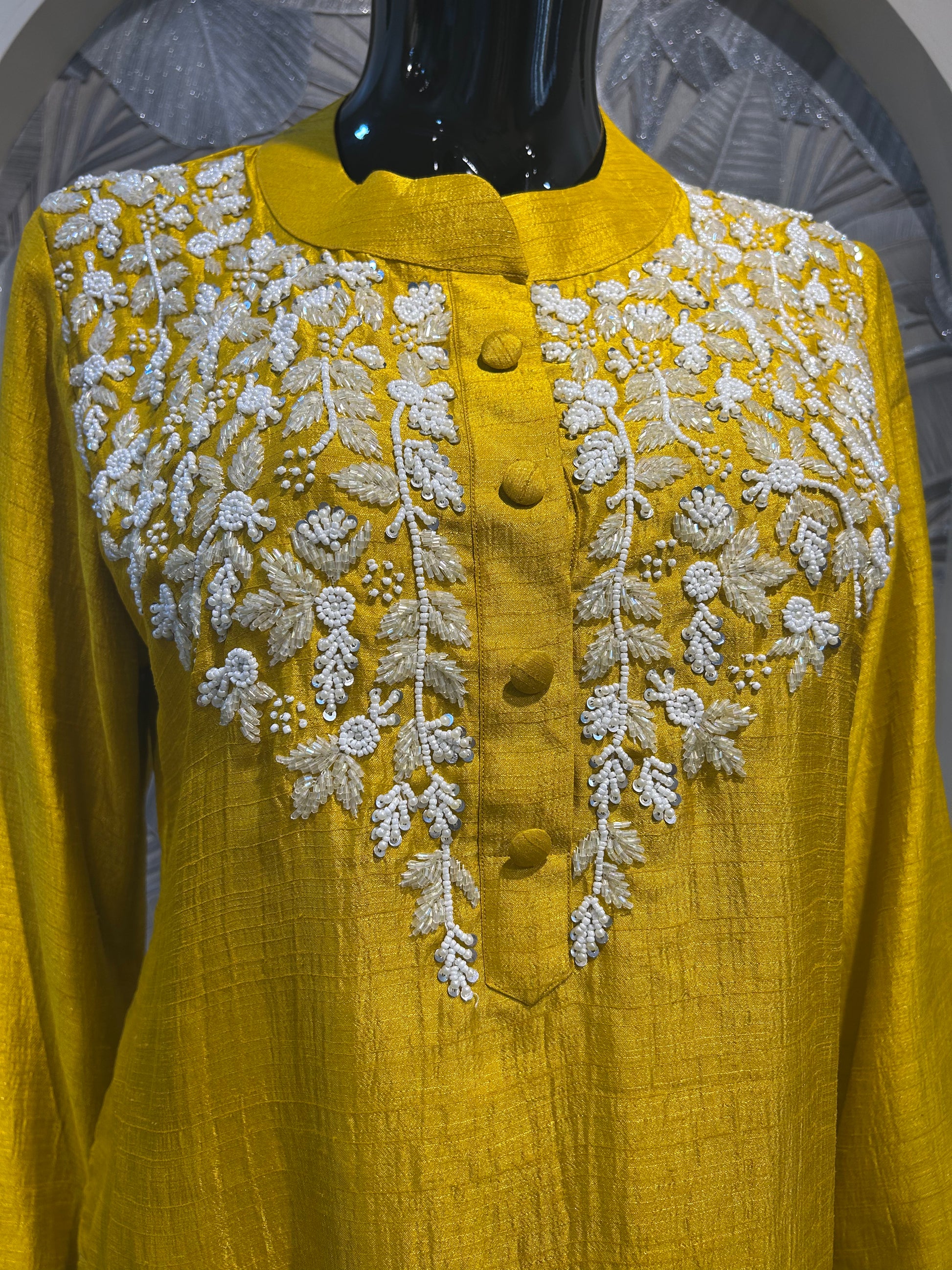 A radiant ensemble in rich harvest gold silk, this suit is designed for those who love understated luxury. The kurta features elegant white thread embroidery across the yoke and shoulders in leafy vine motifs, paired with handcrafted fabric buttons for a refined touch. The straight-cut silhouette is complemented by full sleeves with embroidered cuffs, striking the perfect balance of tradition and modern polish. Paired with matching slim pants, this outfit is ideal for festive luncheons, cultural gatherings, or elegant daytime occasions.