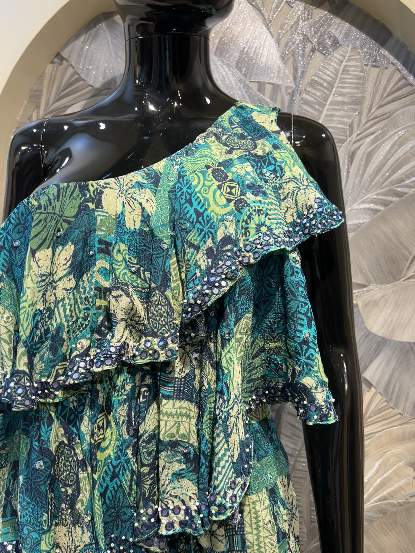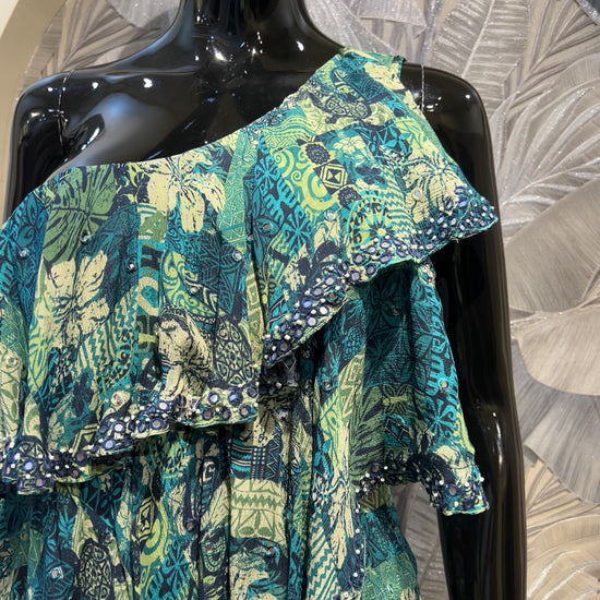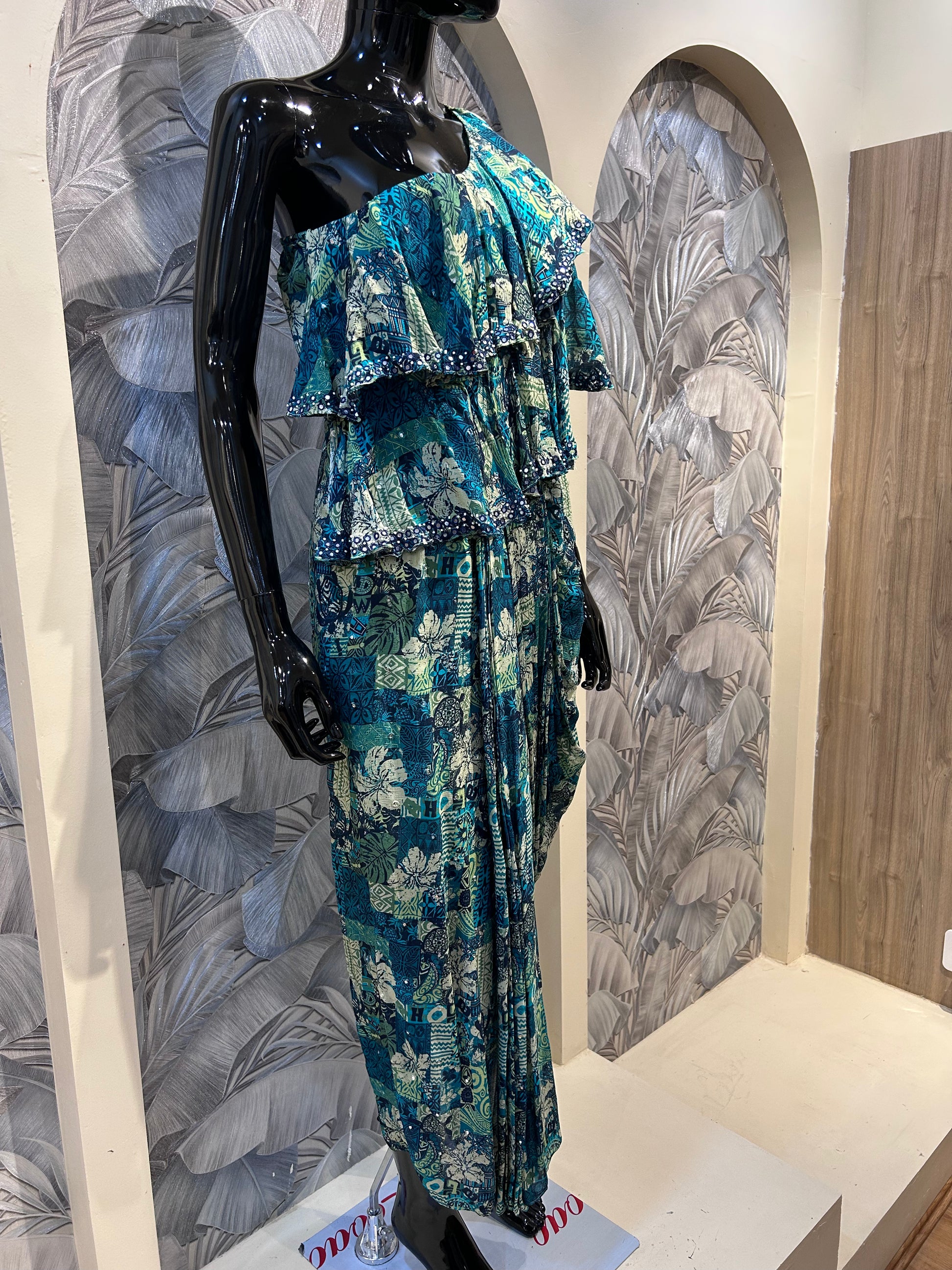 Playful yet elegant, this one-shoulder chiffon set brings together layers of cascading ruffles with a bold multicolored print. Designed in shades of teal, blue, and cream, the fabric flows effortlessly while the asymmetrical neckline adds a modern edge. The draped silhouette is enhanced by its lightweight, breathable chiffon, making it a chic option for summer soirées, resort parties, or destination weddings. Striking and unconventional, this outfit is for those who love making a statement with their style.