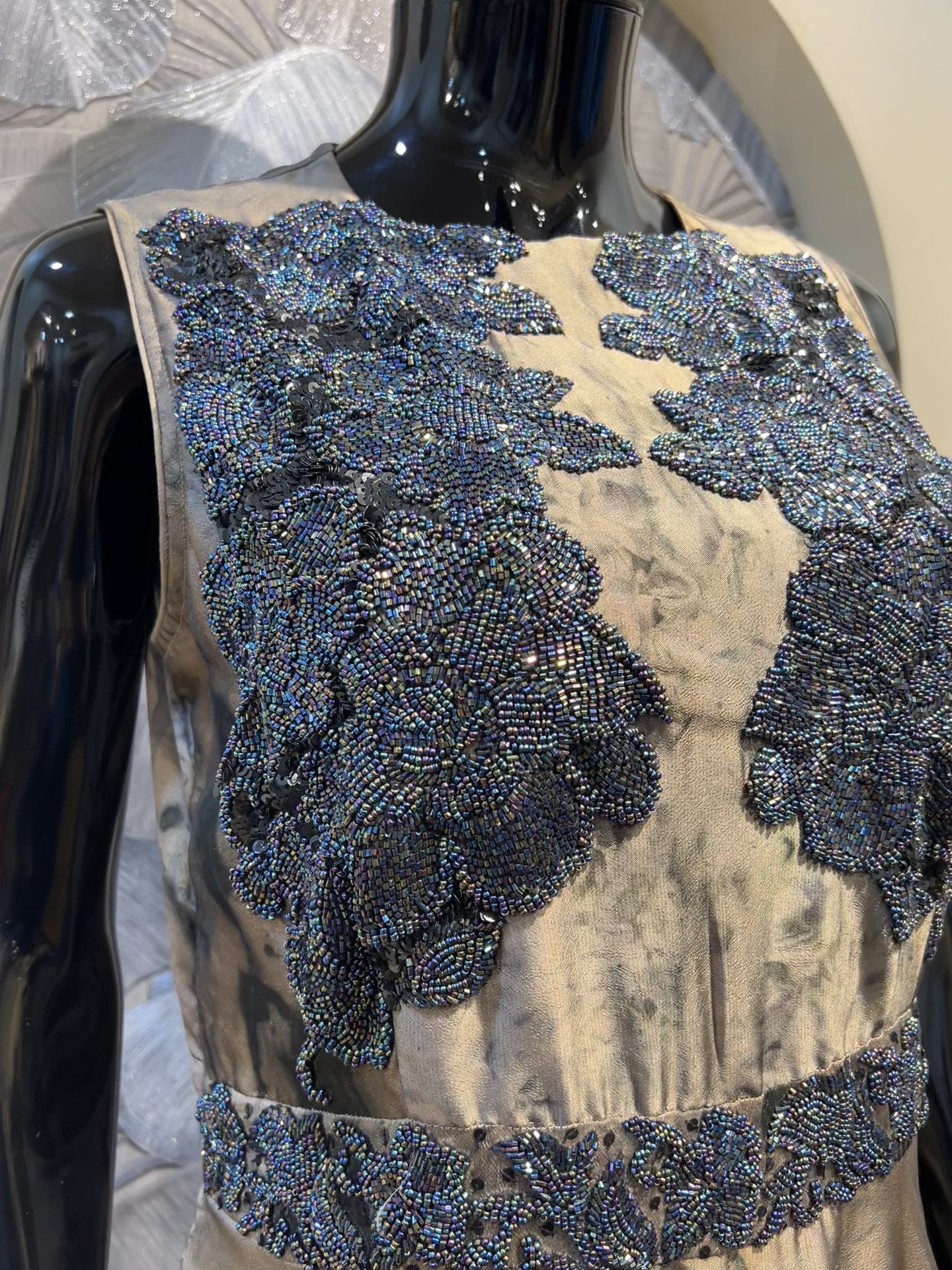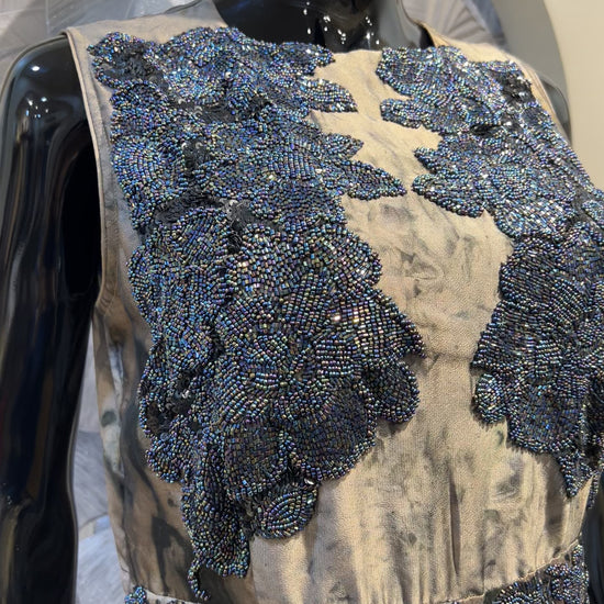 A timeless georgette gown in an artistic old burgundy wash, blending earthy tones with statement detailing. The bodice is adorned with intricate hand-beaded floral appliqué in deep hues, cascading across the chest and waist for a sculpted, regal effect. The flowing skirt falls effortlessly with soft pleats, while the marbled dye effect adds depth and a touch of modern artistry to the traditional silhouette. Perfect for evening receptions, cocktail nights, or weddings, this gown balances elegance with bold contemporary charm.