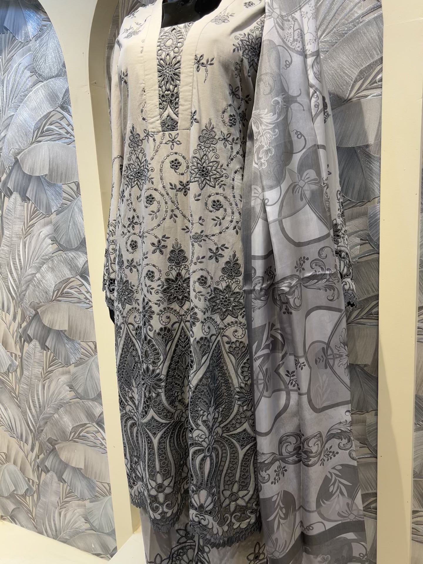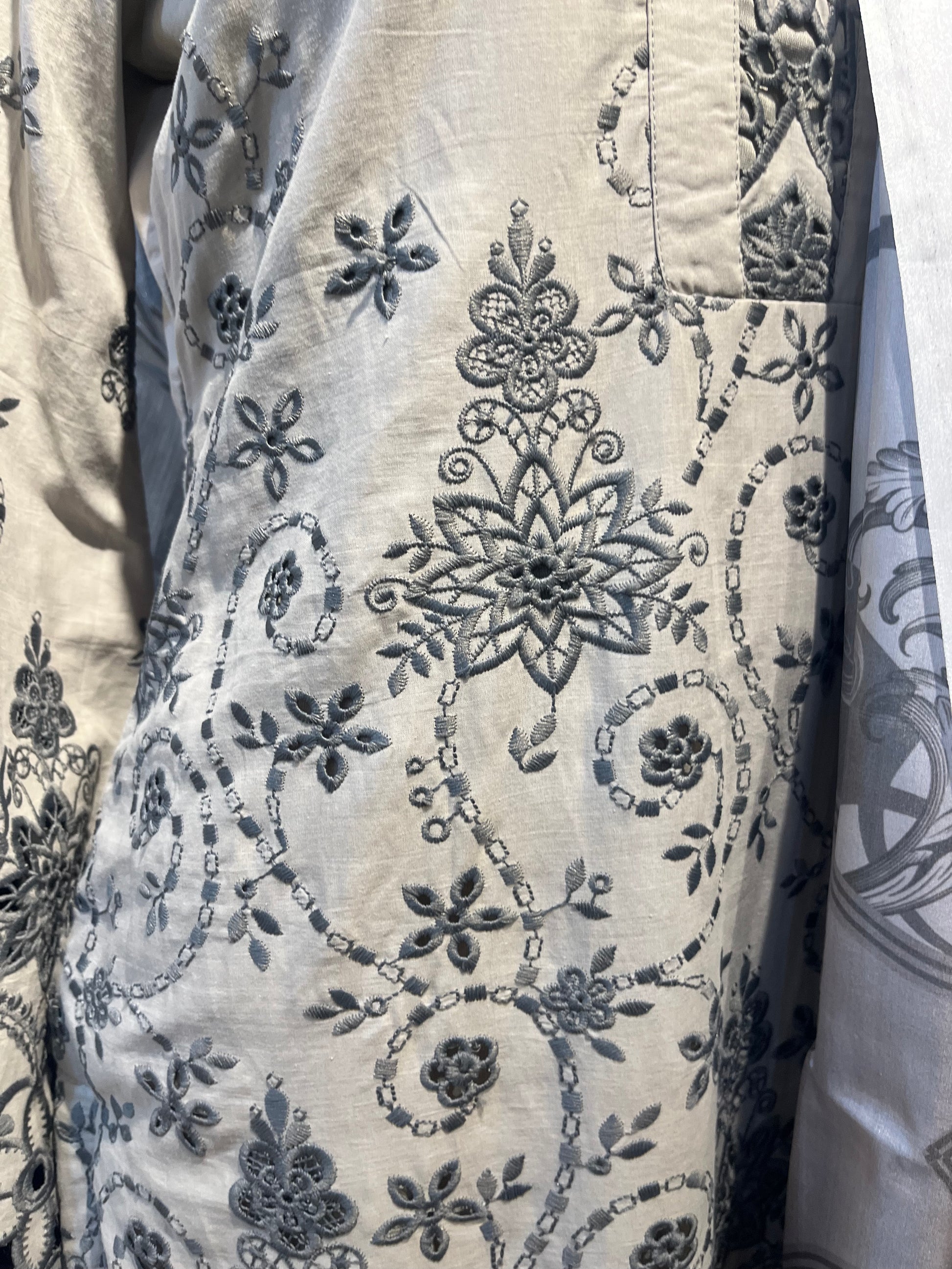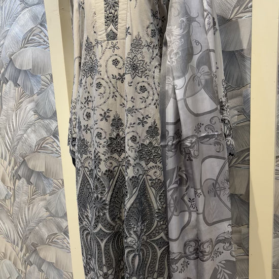 This striking suit in a soft pastel gray base is crafted from breathable cotton, blending subtle color with bold artistry. The kurta is adorned with intricate black thread embroidery in elaborate floral and geometric motifs, enriched by fine cutwork along the hemline and sleeves for a lace-like effect. The neckline features detailed stitch patterns that enhance the silhouette, while the contrasting gray printed dupatta completes the ensemble with elegance. Perfect for festive gatherings, cultural events, or sophisticated daytime wear, this ensemble offers a refined fusion of subtle tones and dramatic embroidery.