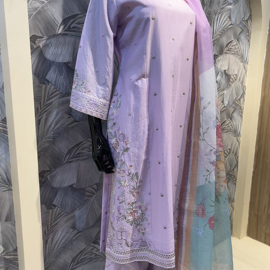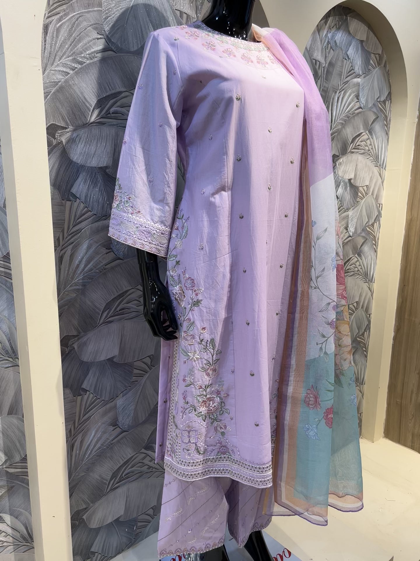 This graceful suit in queen pink is crafted from breathable cotton, blending ease with elegance. The kurta features delicate embroidery in contrasting tones, enhancing the soft pastel base with refined detailing along the neckline and sleeves. Subtle floral motifs add a feminine touch, while the coordinated dupatta completes the ensemble with effortless charm. A versatile outfit, perfect for festive occasions, cultural gatherings, or daytime celebrations, offering understated sophistication in a soothing pastel palette.