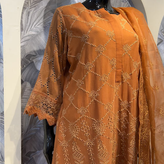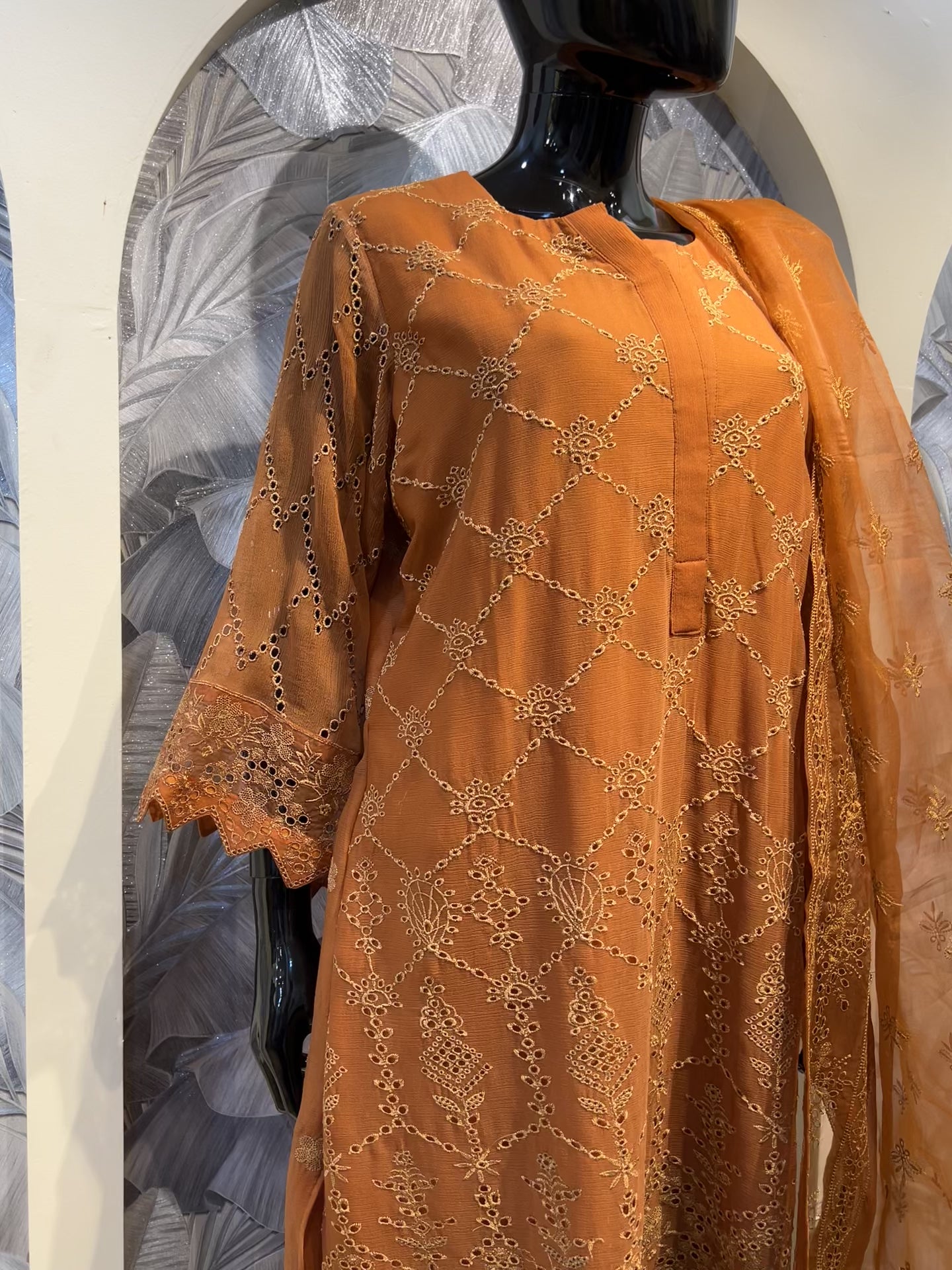 An earthy elegance in warm saddle brown chiffon, this three-piece suit is a versatile pick for festive and casual occasions alike. The kurta features delicate thread embroidery in diamond and floral lattice patterns, giving it a refined, structured look. Scalloped sleeve edges add a graceful finish, while the dupatta is kept airy and light with small embroidered motifs, ensuring balance and wearability. Perfect for those who prefer understated sophistication with a touch of traditional charm, this ensemble blends comfort and elegance seamlessly.