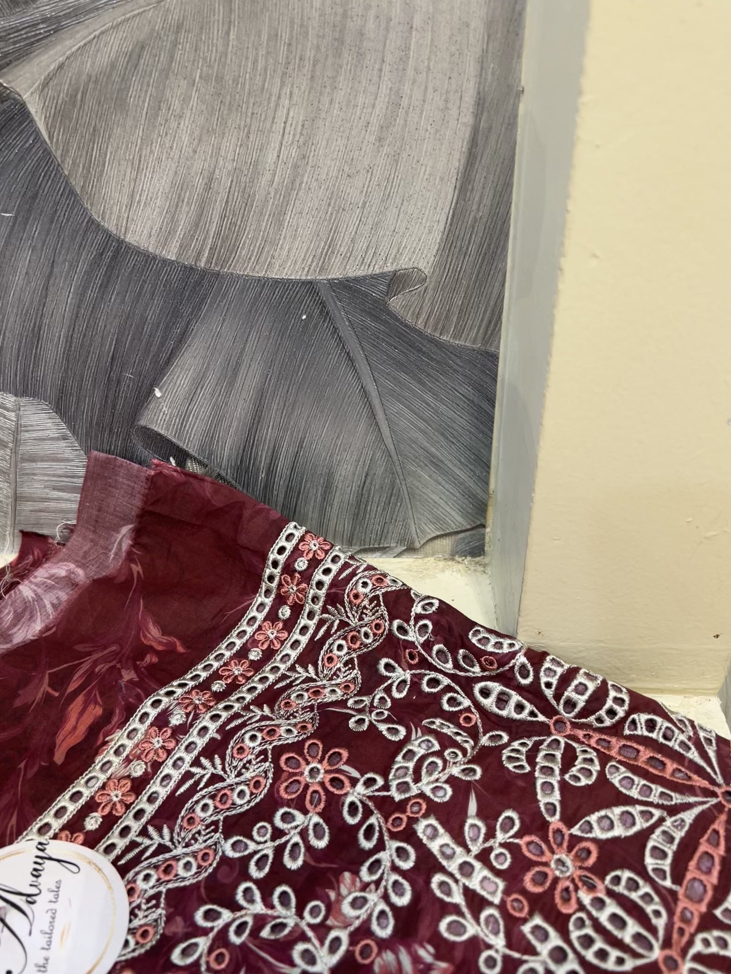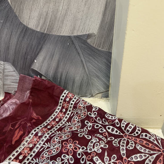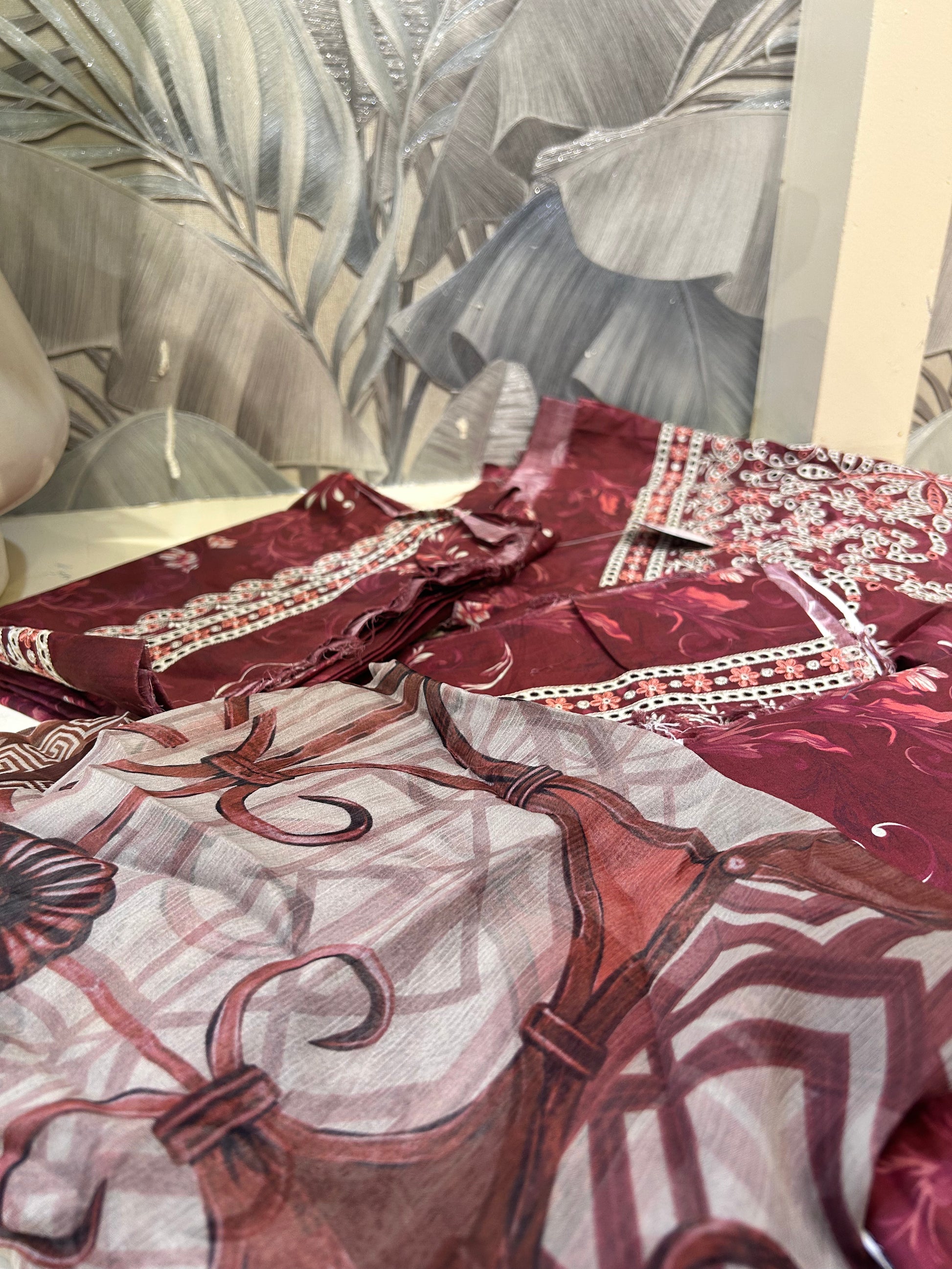 Rich, regal, and effortlessly refined – this smoky topaz ensemble embodies timeless elegance. The chiffon dupatta is intricately printed and bordered with delicate embroidery, while the cotton trousers and cotton salwar ensure a structured yet breathable feel. The deep topaz hue, combined with the elegant thread and sequin detailing, makes this set perfect for festive evenings or formal celebrations that call for grace with a touch of grandeur.