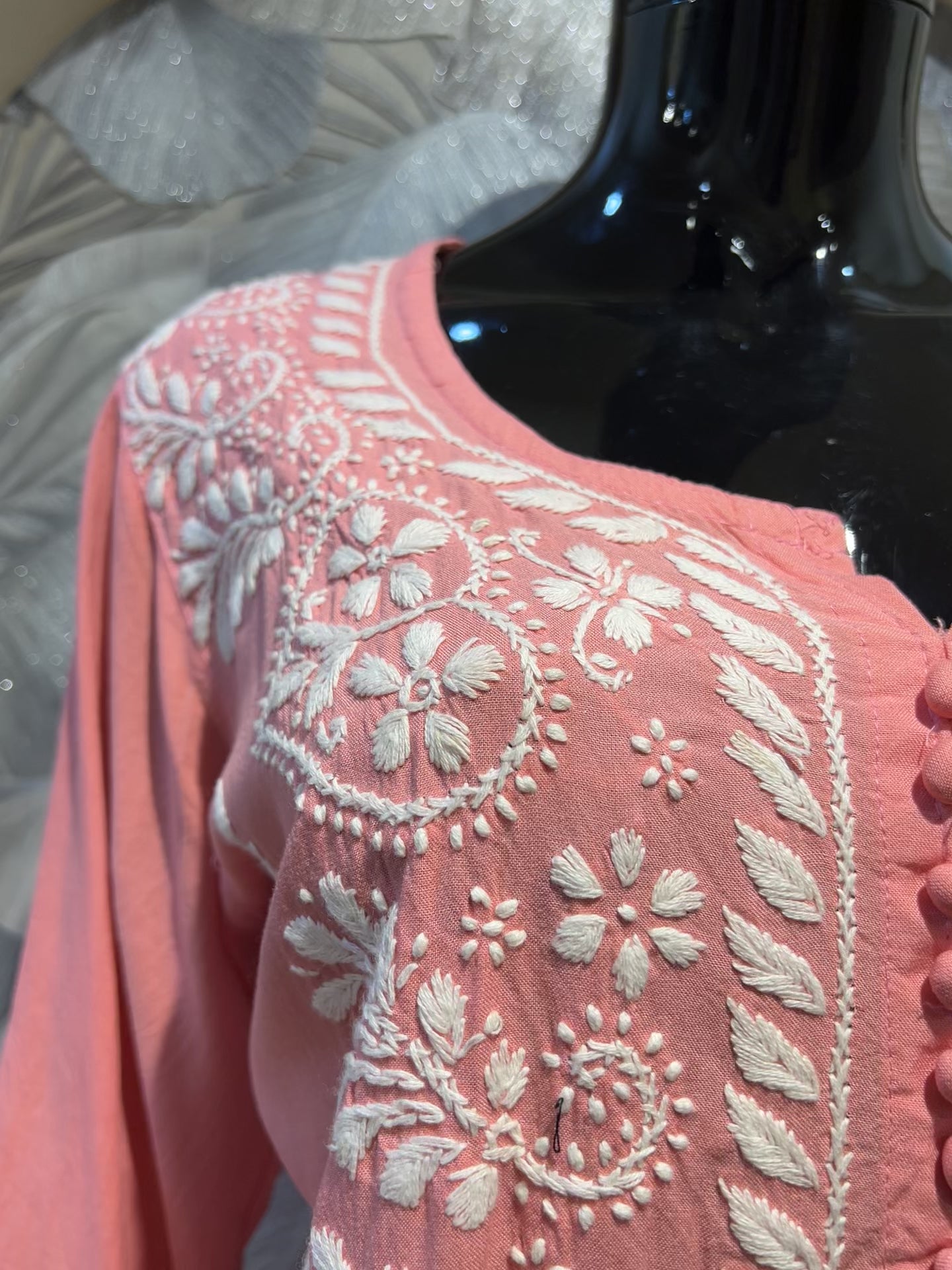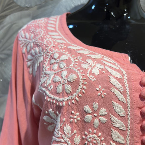 A soothing tulip pink cotton kurta set adorned with intricate white chikankari embroidery. The delicate floral patterns and handcrafted detailing on the neckline and hem lend it a timeless elegance. Soft, breathable, and effortlessly graceful, this set is perfect for casual outings, festive lunches, or everyday comfort with a refined touch.