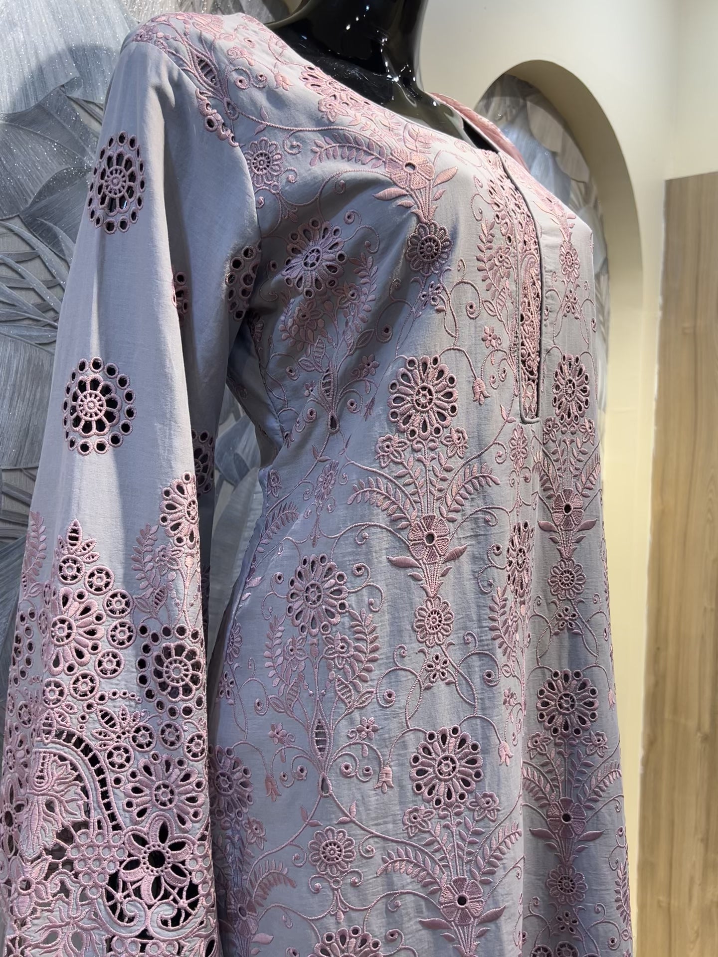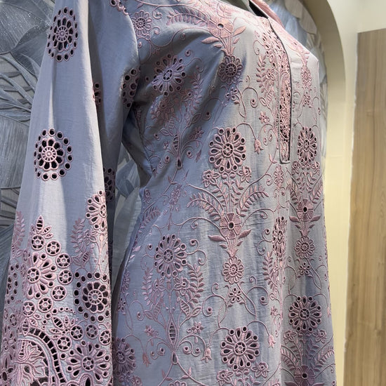 This refined suit in a muted tuscany base is tailored from breathable cotton, offering comfort with striking artistry. The kurta is richly adorned with parrot pink thread embroidery in intricate floral and botanical motifs, enhanced by eyelet cutwork along the hem and sleeves. The contrast between the soft tuscany shade and vivid pink embroidery creates a vibrant yet sophisticated look. Paired with a matching dupatta carrying coordinated detailing, this ensemble is ideal for festive occasions, cultural gatherings, or elegant daytime wear, blending modern color play with timeless craftsmanship.