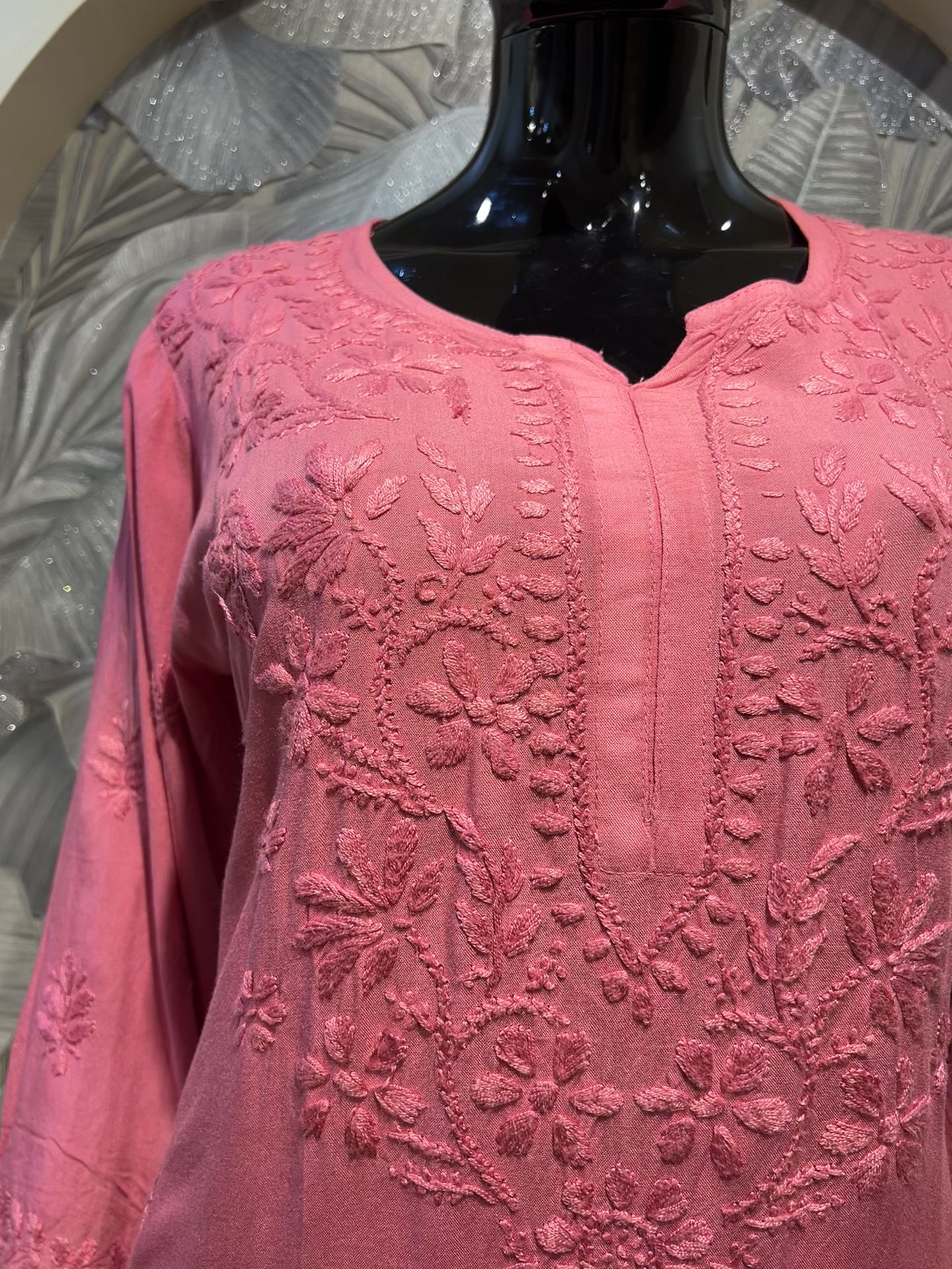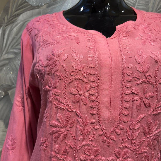 A striking ultra red cotton kurta set featuring intricate tonal chikankari embroidery along the neckline, sleeves, and front panel. The detailed threadwork adds depth and refinement to the rich hue, while the soft cotton fabric ensures breathable comfort throughout the day. Paired with matching bottoms, this set perfectly balances traditional charm and effortless sophistication—ideal for festive gatherings or elegant daytime wear.