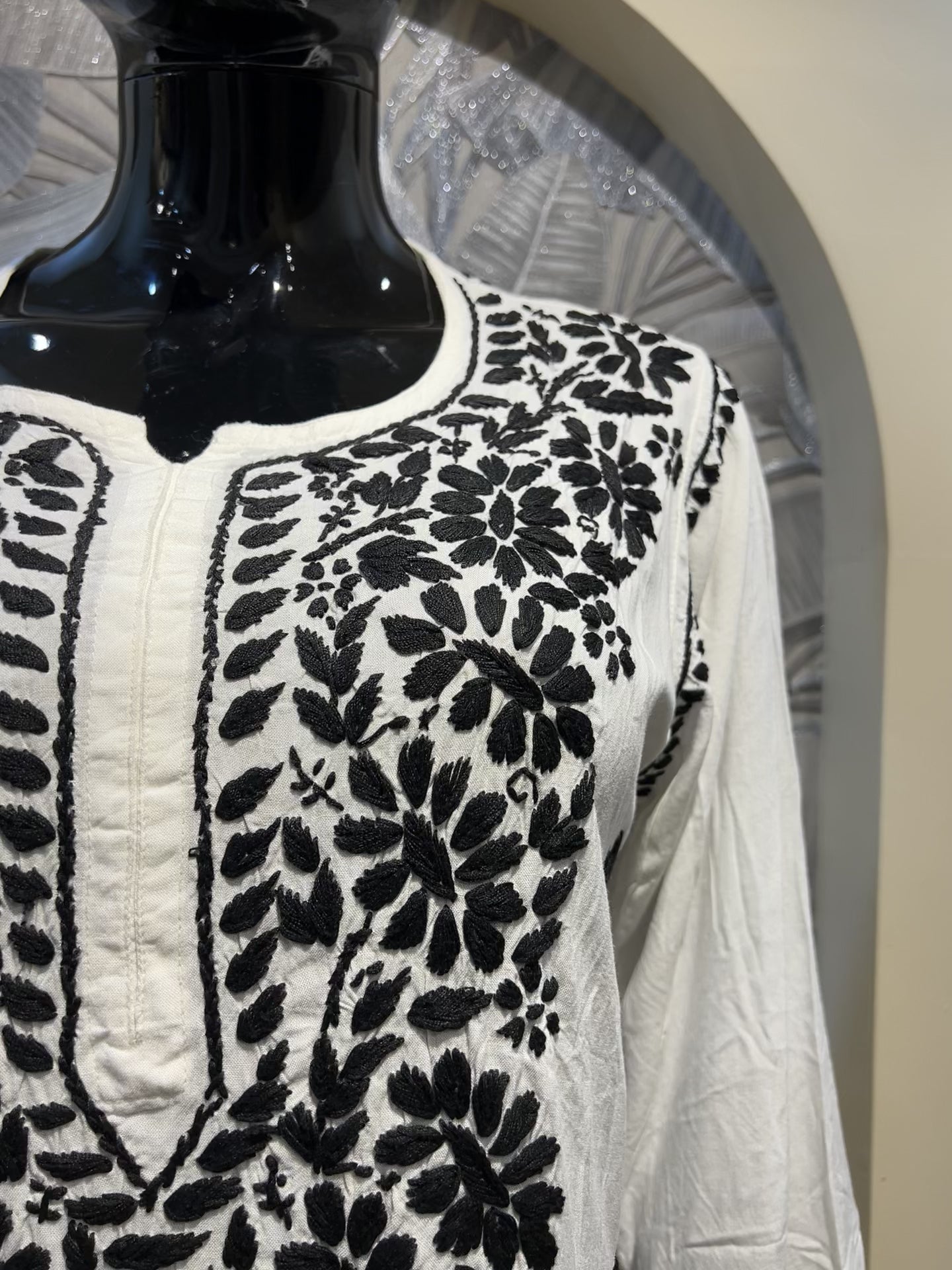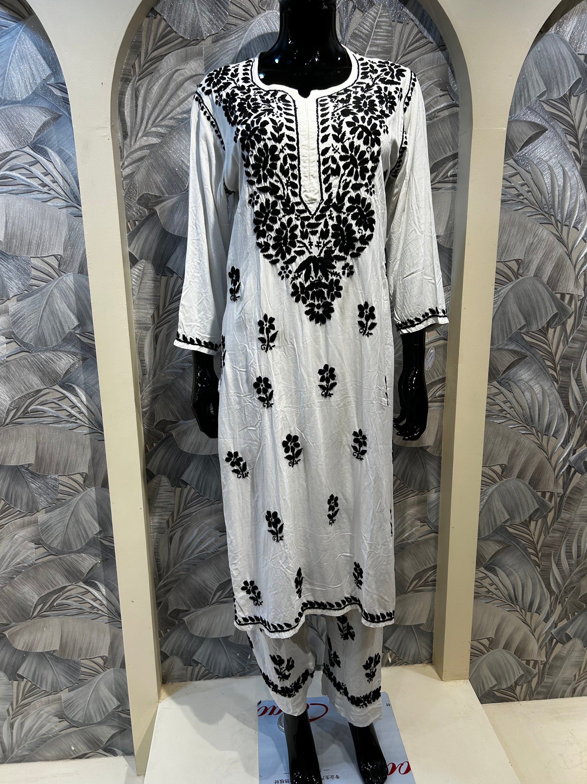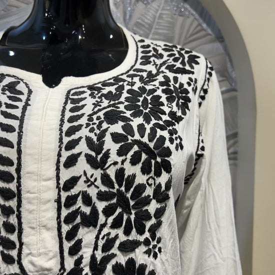 A timeless white cotton kurta set elevated with striking black chikankari embroidery. The contrast floral detailing across the neckline, sleeves, and hem adds a bold yet refined edge, balancing elegance with statement appeal. Crafted from soft breathable cotton, this set is perfect for festive gatherings, casual evenings, or elegant daywear that stands out effortlessly.
