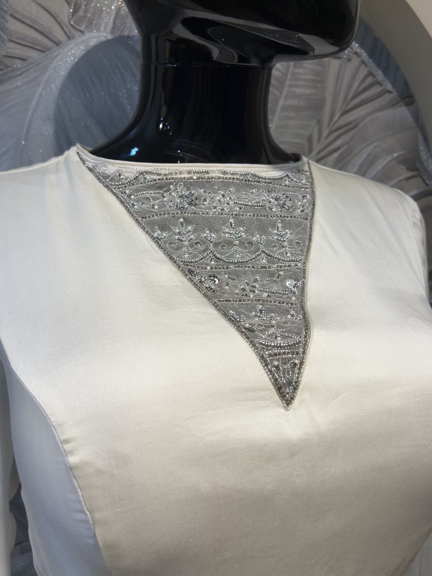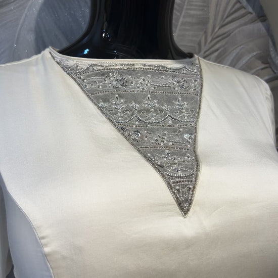 White Satin Gown with Embroidered Cuffs and Yoke